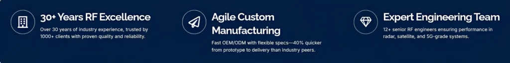 12+ senior RF engineers ensuring performance in radar, satellite, and 5G-grade systems.
