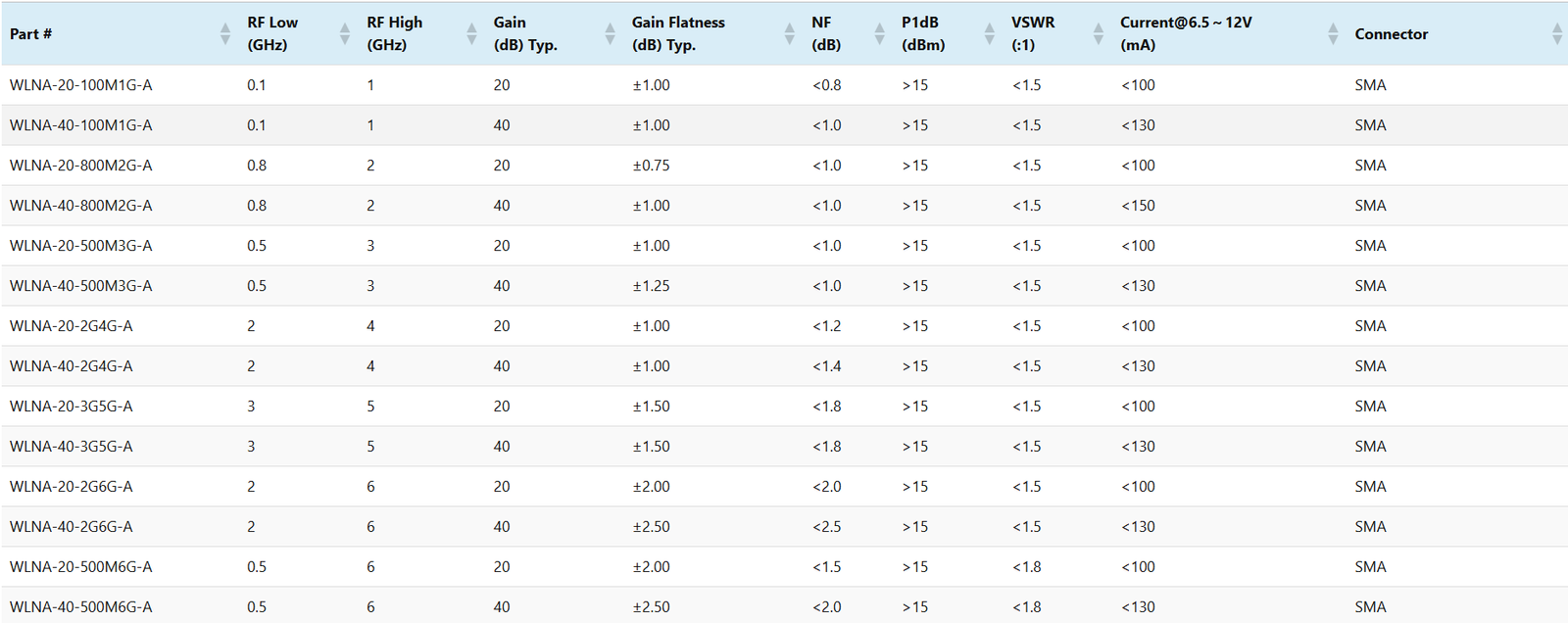 WLNA-20-100M1G-A0.1120±1.00<0.8>15<1.5<100SMA