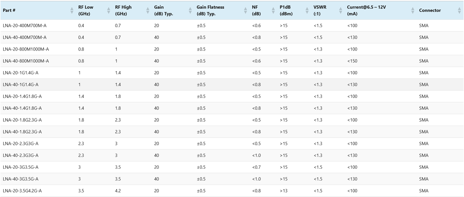LNA-20-800M1000M-A0.8120±0.5<0.5>15<1.3<100SMA