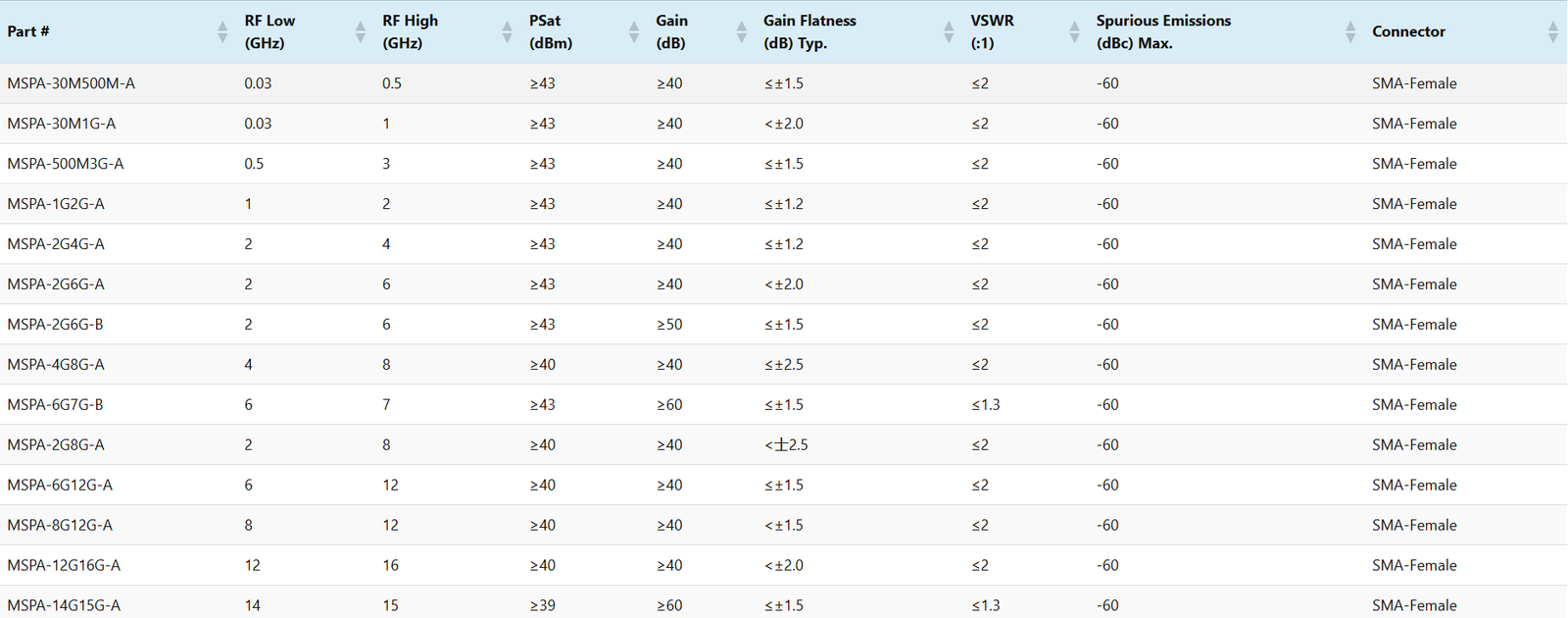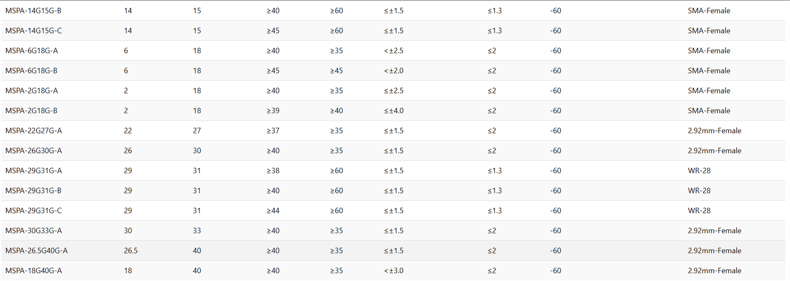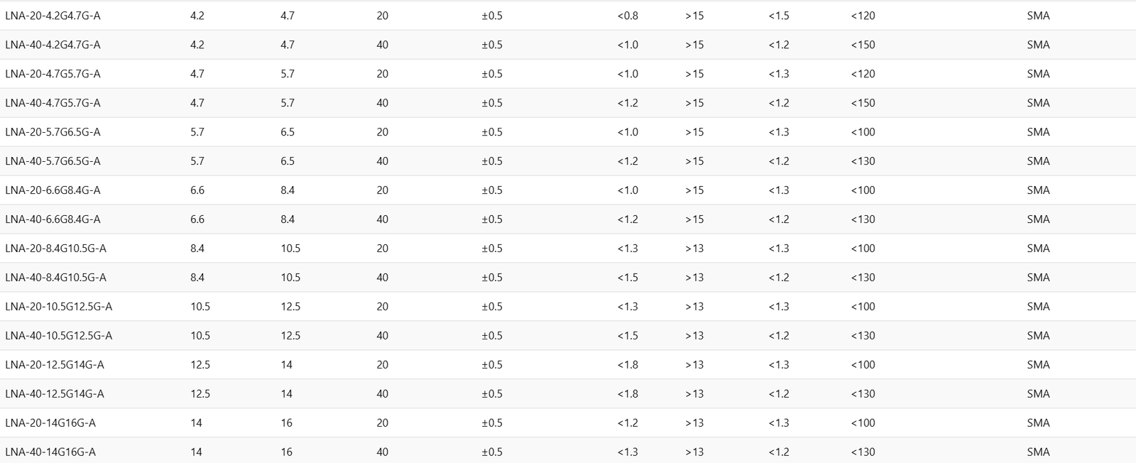 LNA-40-4.2G4.7G-A4.24.740±0.5<1.0>15<1.2<150SMA